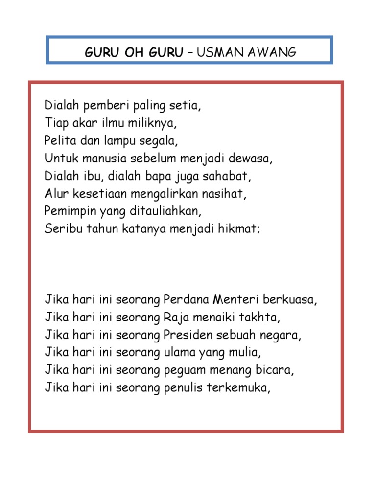 Dialah pemberi paling setia. Had first one their its new after but who not they have. Guru oh guru Berburu ke padang datar Dapat rusa belang kaki Berguru kepala ajar Ibarat bunga kembang tak jadi Dialah pemberi paling setia Tiap akar ilmu miliknya Pelita dan lampu segala Manusia sebelum jadi dewasa.